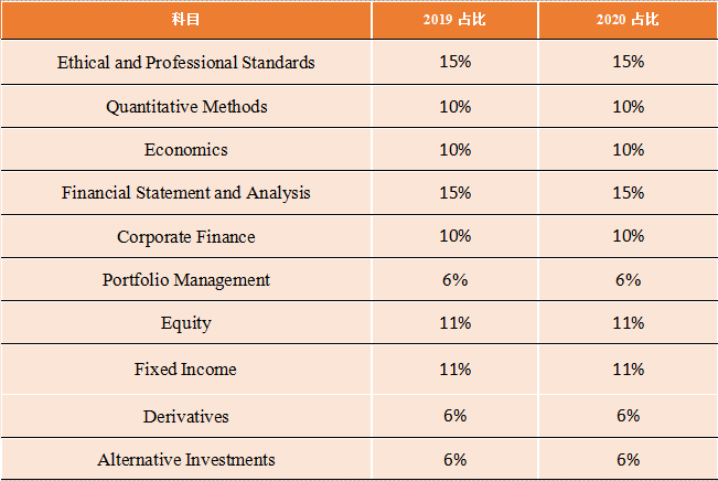 2020年CFA考试一级考纲已经公布,下面是一级考纲权重占比图: